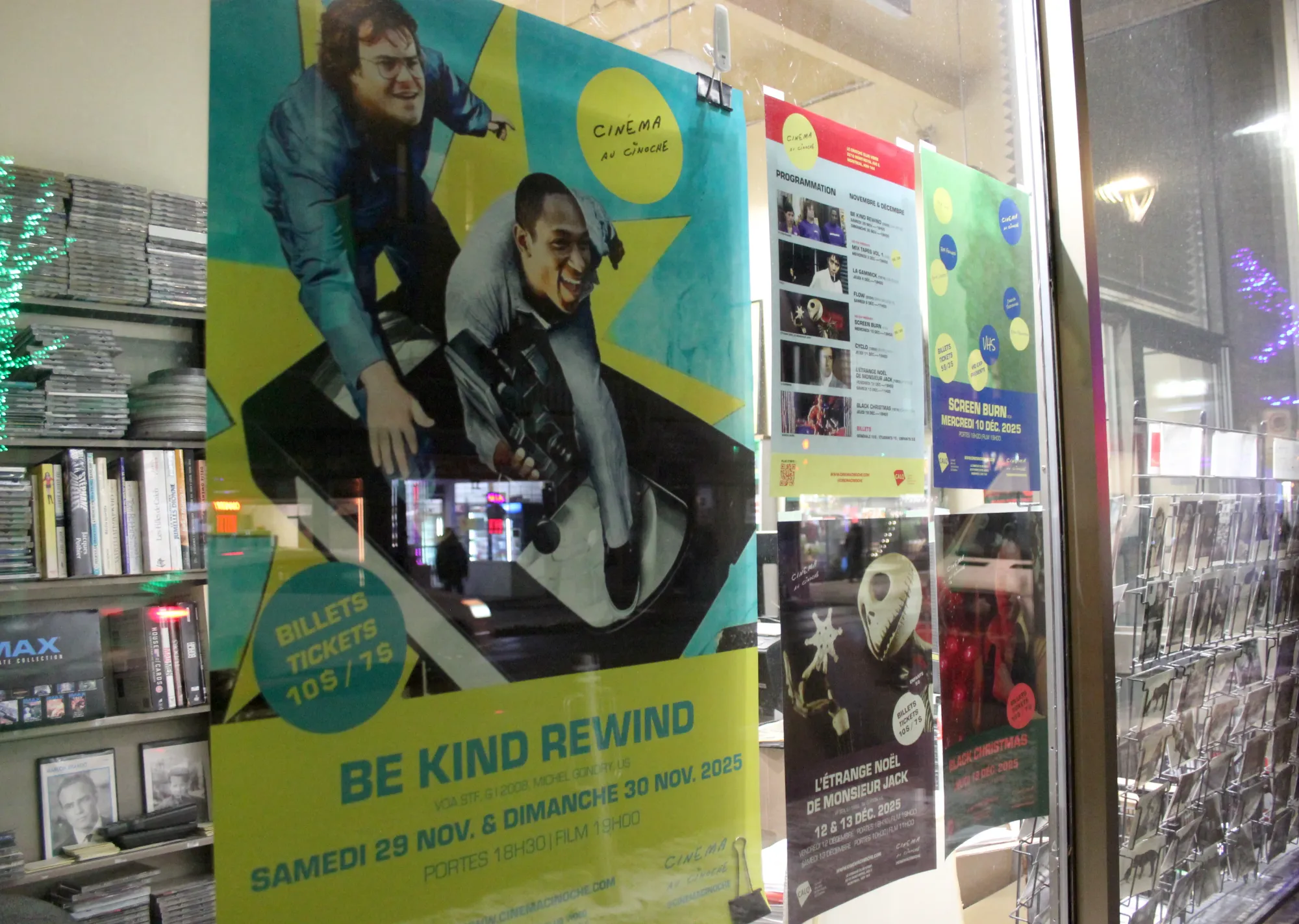 C’est le film Be Kind Rewind qui a brisé la glace. On pourrait déduire que ce choix était un genre d’hommage conceptuel puisque celui-ci portait sur «un cinéma communautaire improvisé dans un vidéoclub – projeté dans un vidéoclub communautaire!»