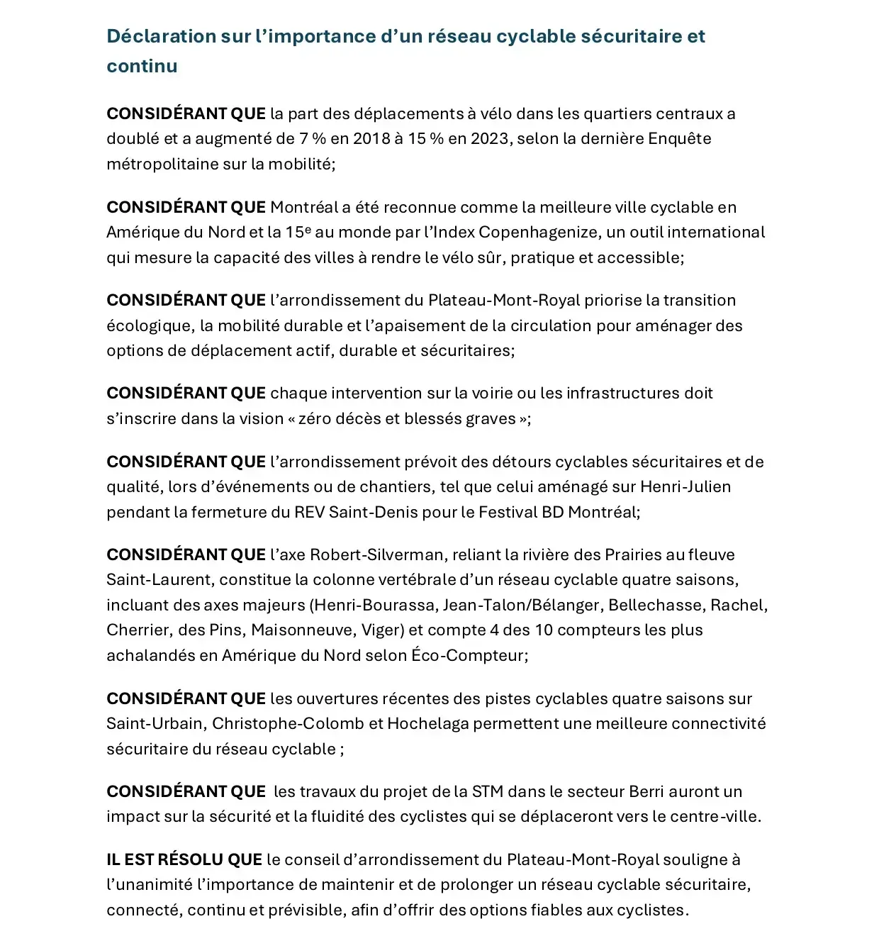 «Dans un contexte où plusieurs pistes cyclables sont remises en question par l'administration centrale, dans plusieurs arrondissements, dont Ville-Marie, Hochelaga–Maisonneuve, Ahuntsic–Cartierville et Côte-des-Neige–NDG, il est essentiel qu'on rappelle une chose simple : la sécurité de nos citoyens n'est pas négociable», a-t-il soutenu.