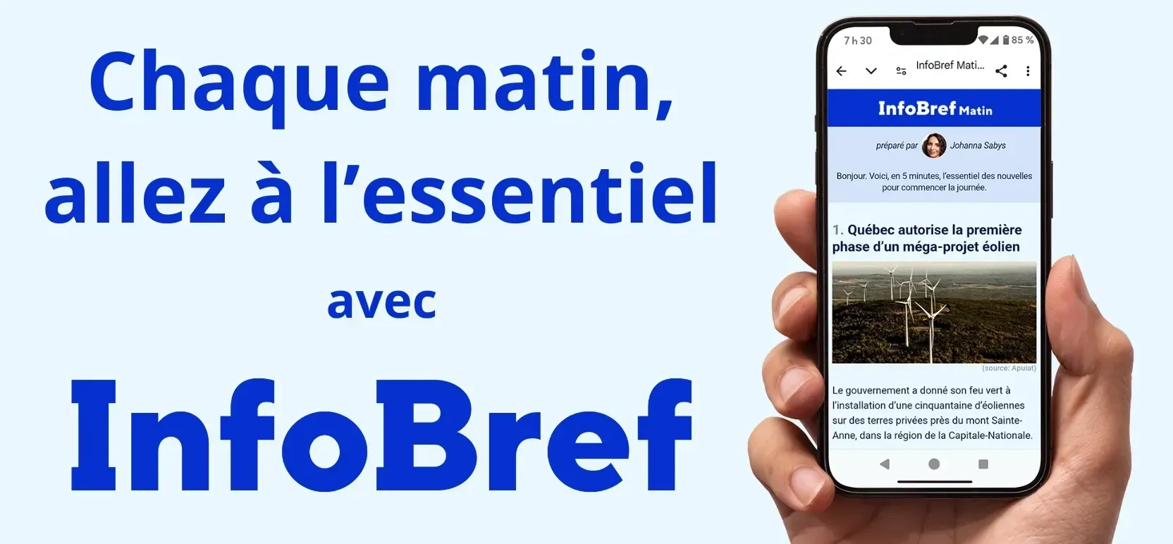 Commencez votre journée bien informé. InfoBref, un média québécois indépendant, vous donne chaque matin, en seulement 5 minutes, l’essentiel des nouvelles nationales et internationales. C’est un résumé simple, neutre, rapide… et gratuit!