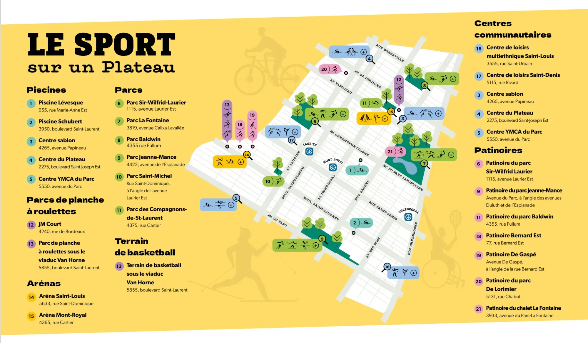 Carte des espaces sportifs du Plateau, issue du Plan d'action en activité physique et sportive.