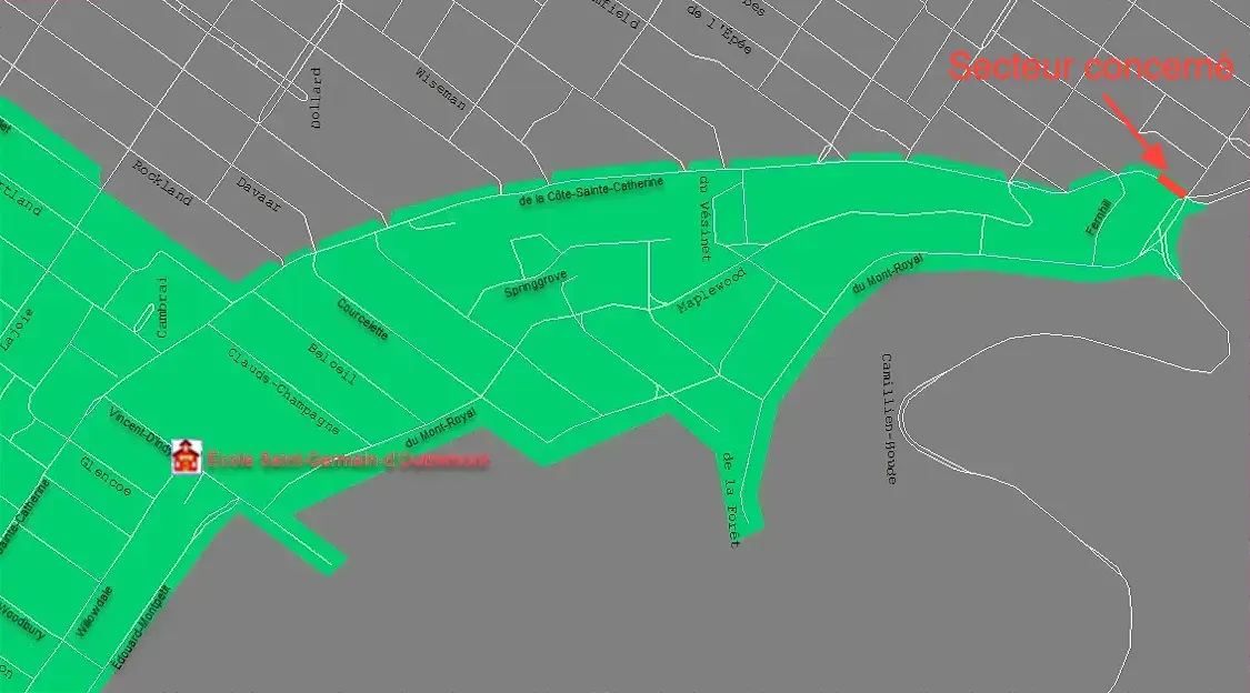 Les quelques adresses impaires sur le chemin de la Côte-Sainte-Catherine, à proximité de l’avenue du Mont-Royal et qui font partie de l’arrondissement du Plateau-Mont-Royal, se trouvent quant à elles sur la limite territoriale de l’école Saint-Germain-d’Outremont. Les ménages qui s’y trouvent peuvent donc choisir d’y envoyer leurs enfants au lieu de l’école Saint-Enfant-Jésus (CSSDM) s’ils le souhaitent.