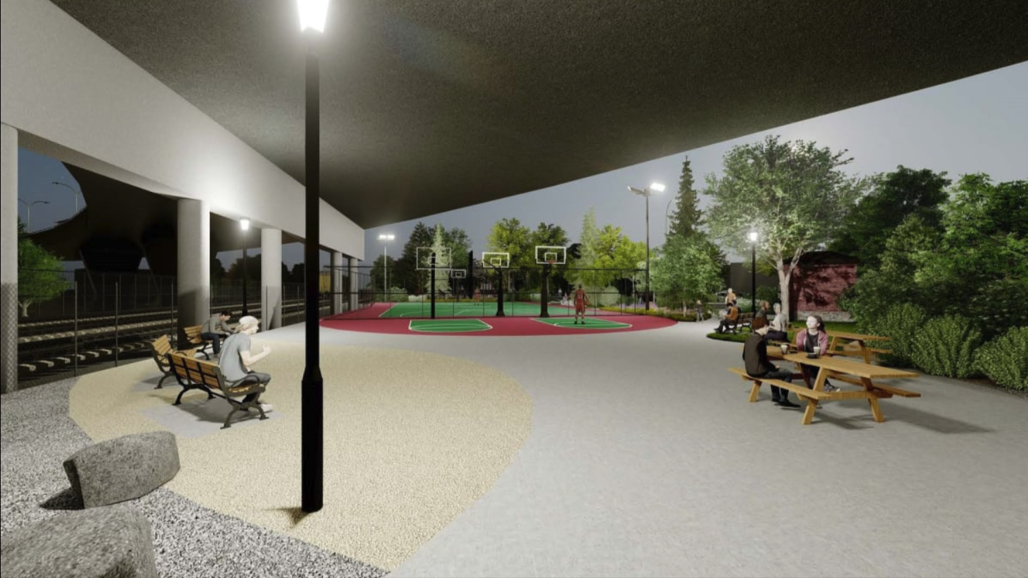 Une toilette autonettoyante a déjà été installée sur place. Selon les rendus, deux paniers additionnels seront placés à l’extérieur du terrain clôturé qui, lui, pourra accueillir des matchs conventionnels.