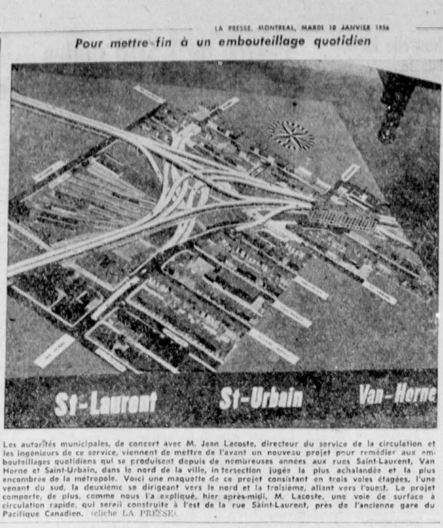 Début 1956, Jean Lacoste, le directeur du nouveau Service de la circulation de la Ville de Montréal, dévoile la maquette d’un projet d’échangeur autoroutier destiné à mettre fin aux embouteillages quotidiens qui se produisent dans le secteur Saint-Laurent, Saint-Urbain et Van Horne, le «plus achalandé et le plus encombré de la métropole», notamment en raison de l’obstacle formé par la barrière ferroviaire.