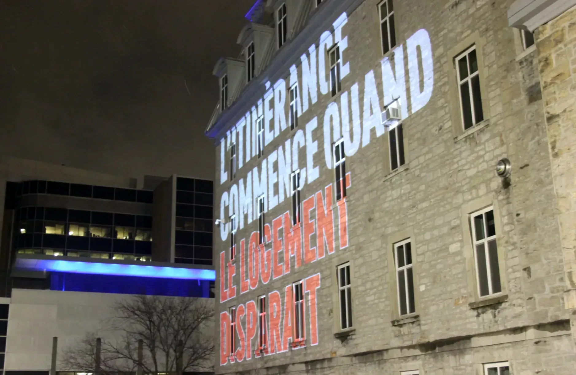 Un manque de logements abordables mis en lumière. Des messages soulignant l'importance de l'abordabilité en habitation ont été projetés sur trois bâtiments emblématiques du Plateau: l'entrepôt Van Horne, l'Hôtel-Dieu et l'ancien Institut des Sourdes-Muettes.