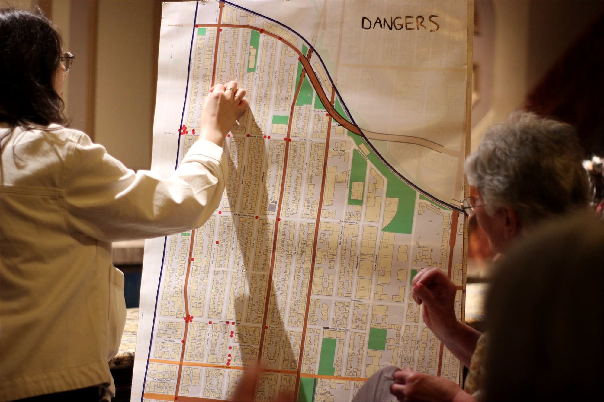 Plus de 70 personnes se sont réunies au Théâtre Rialto mercredi soir pour identifier des problèmes et proposer des solutions afin d'améliorer la sécurité des piétons dans le Mile End.