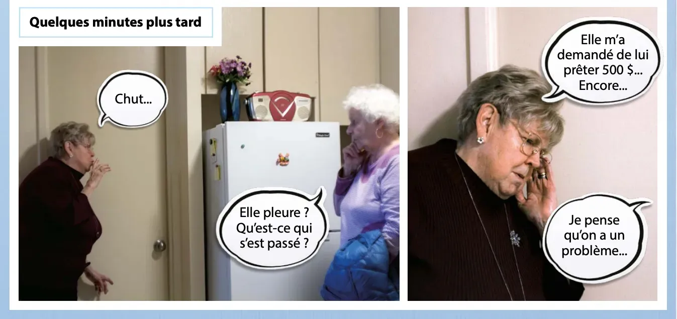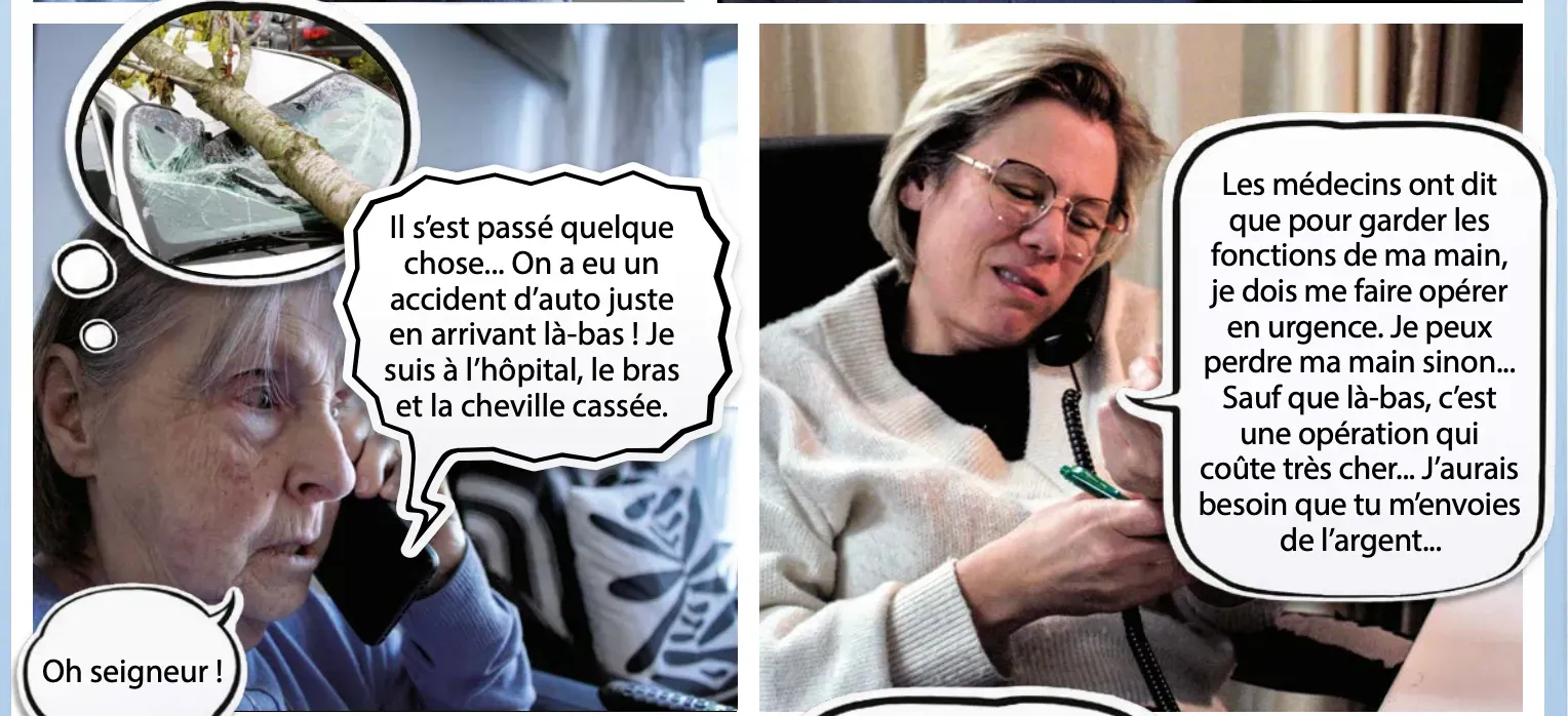 La première illustre un cas de fraude de type «grands-parents». Le personnage de Gisèle y reçoit un appel d’une personne se faisant passer pour sa petite-fille. Cette dernière dit être à l’étranger et devoir se faire opérer en urgence. Elle demande à Gisèle de lui faire parvenir 3000$ pour ce faire.