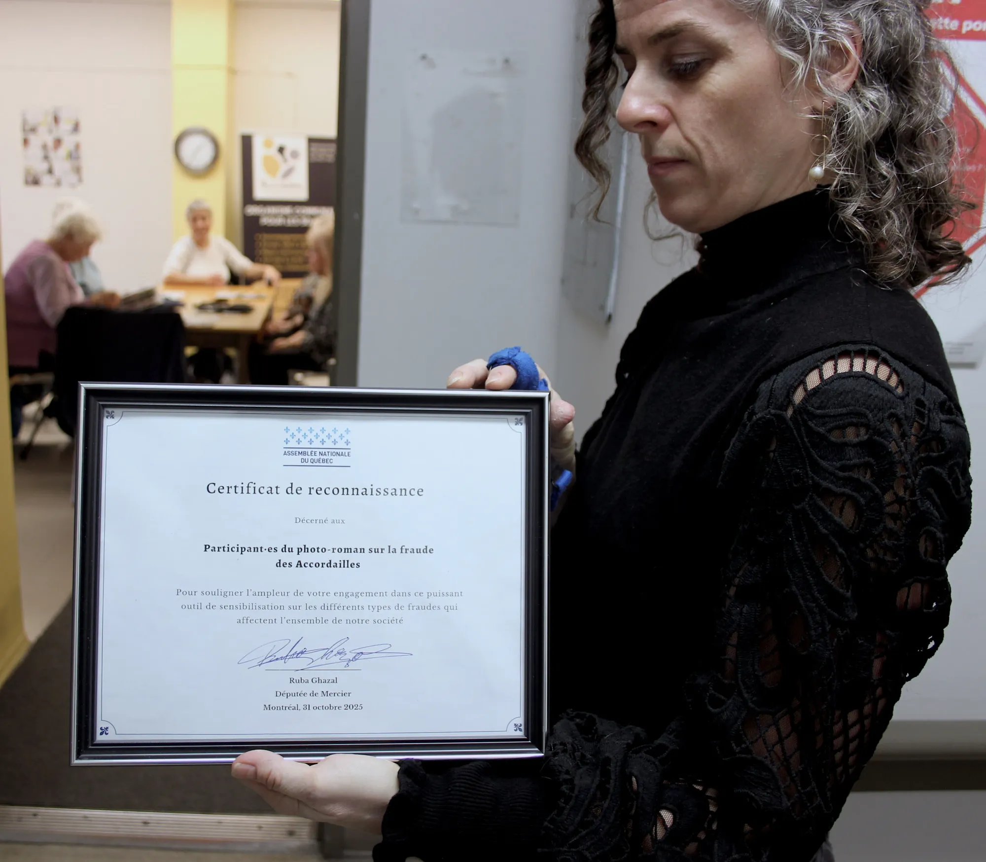 Sherley McLean montre un exemplaire du certificat qui a été décerné à l'ensemble de participants par la députée de Mercier, Ruba Ghazal, «pour souligner l'ampleur de [leur] engagement dans ce puissant outil de sensibilisation sur les différents types de fraudes qui affectent l'ensemble de notre société». – photos : Devin Ashton-Beaucage