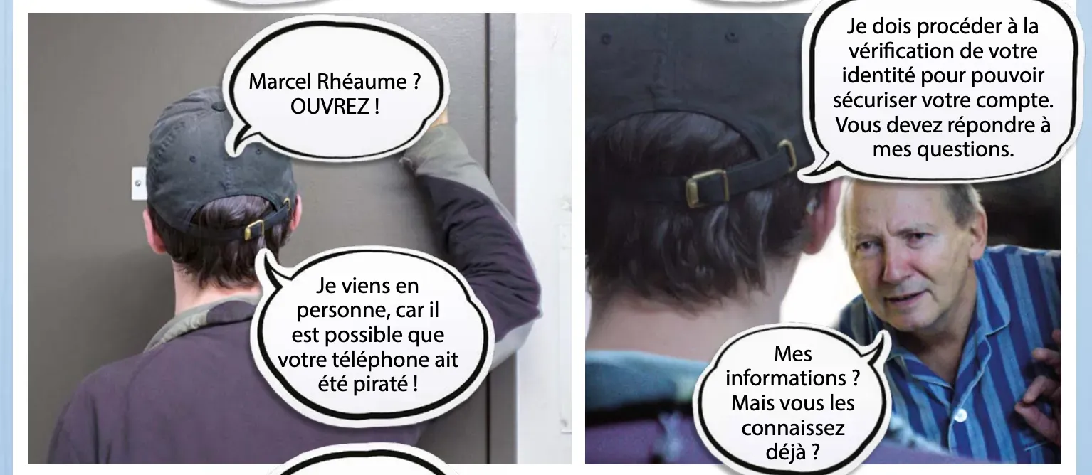 Dans la deuxième histoire, Marcel se fait réveiller par un homme prétendant être un représentant de sa banque, qui lui réclame ses informations personnelles en faisant croire à une brèche de sécurité. Il s’agit d’une fraude de type «faux représentant».