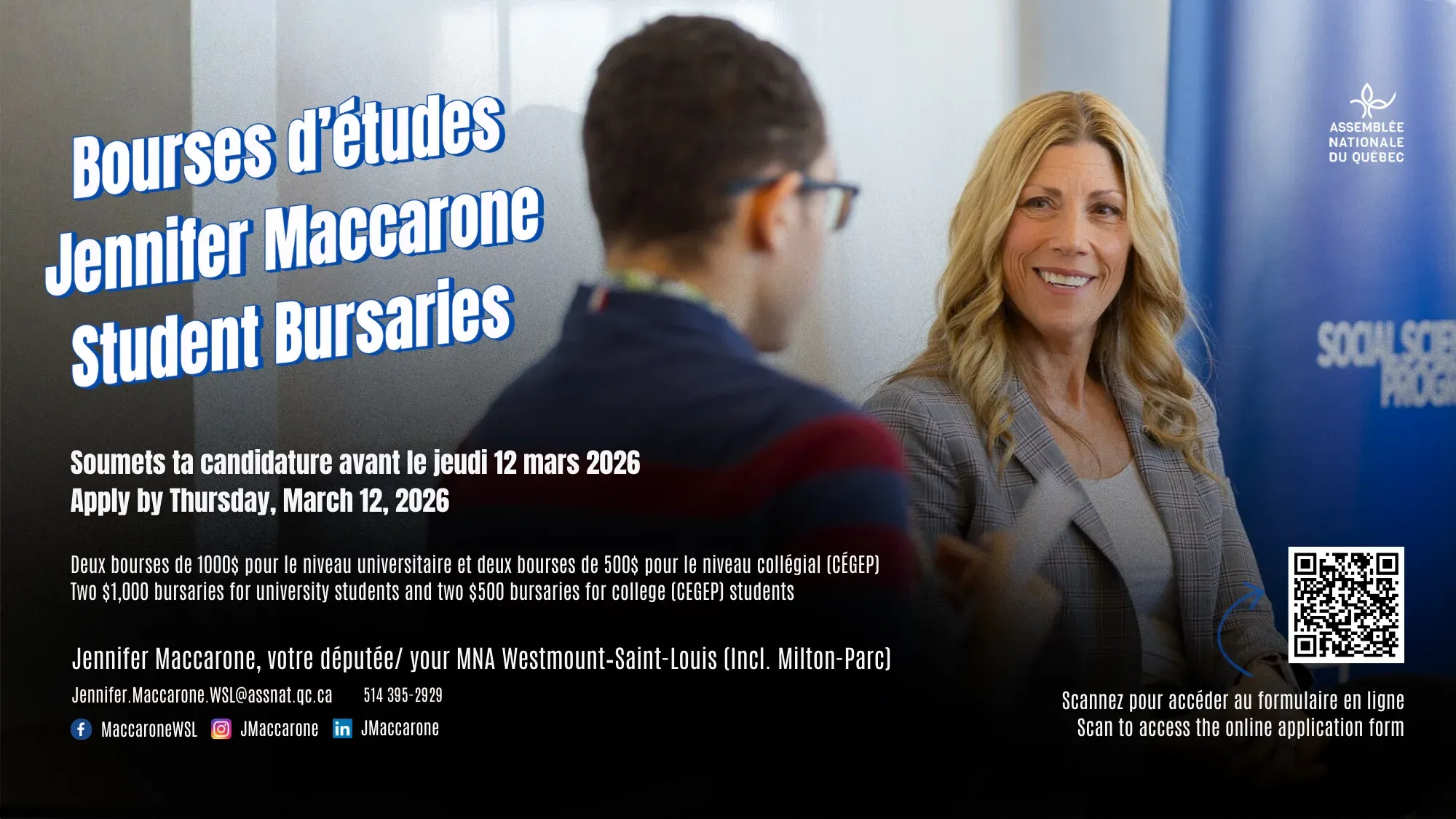 Étudiants recherchés: 3000 $ en bourses et une immersion politique. Le compte à rebours est lancé pour obtenir l’une des quatre bourses offertes par la députée Jennifer Maccarone aux étudiants qui résident dans la circonscription de Westmount-Saint-Louis, territoire qui englobe Milton-Parc.