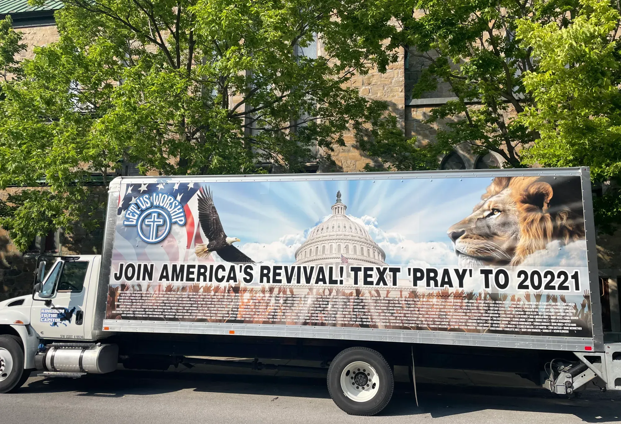 Ce camion, stationné près de l'église Ministerios Restauración, accompagnait la tournée de Sean Feucht, chanteur chrétien associé au mouvement MAGA (juillet 2025).