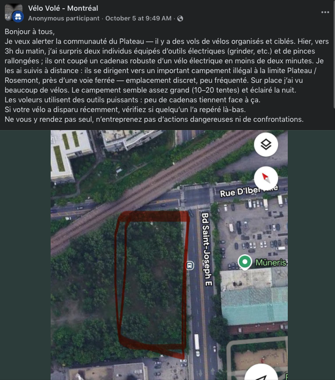 Les individus victimes de vol qui aimeraient récupérer leur bicyclette peuvent communiquer avec le poste de quartier 38 au cohabitation.pdq38@spvm.qc.ca et tenter de voir si elle s’y trouve en prenant un rendez-vous.