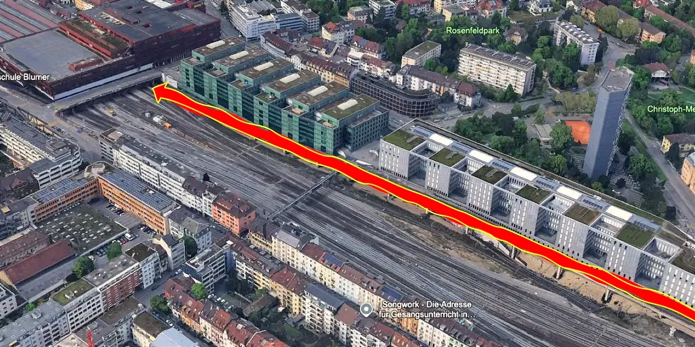 Un collège, un centre de tri postal ainsi que des bureaux avaient été construits sur une surface soutenue au-dessus de la gare de triage du réseau de chemin de fer fédéral.